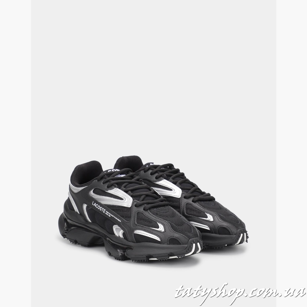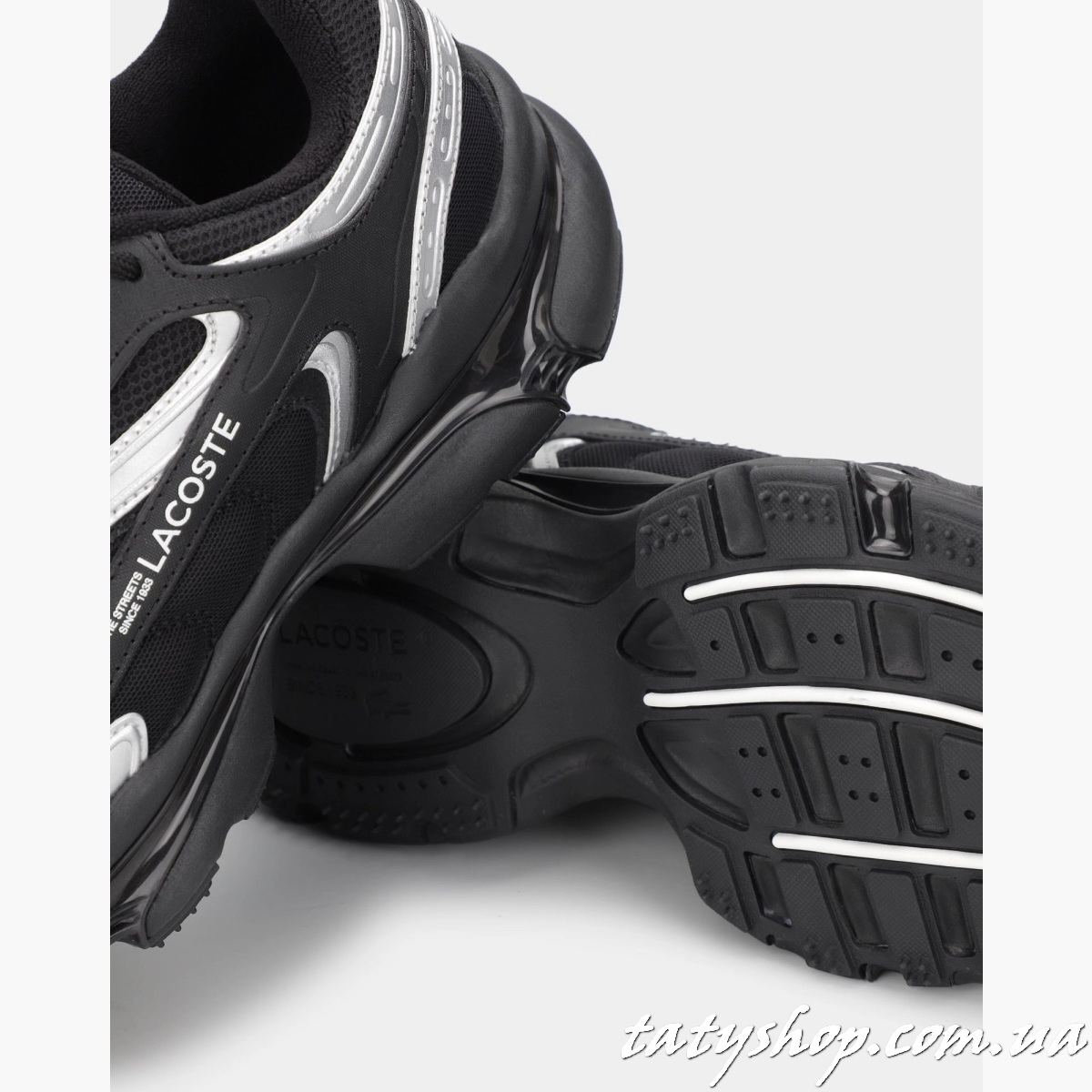 Дизайн моделі відрізняється стриманістю та водночас сучасними акцентами, що включають логотип Lacoste на боковій стороні та унікальні деталі на шнурівці. Чорний колір робить ці кросівки універсальним вибором для різних стилів одягу.